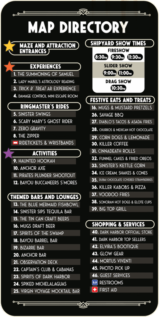 Access to Dark Harbor’s secret speakeasies is limited to persons possessing one of Lady Mabel’s mystic tokens or a valid VIP badge for that evening. If you’d like to guarantee access, you can make an appointment to see Lady Mabel for an “astrology reading,” or upgrade to a VIP ticket.