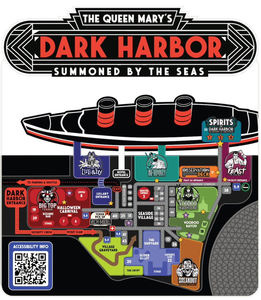 Step aboard the Queen Mary, learn about the ship’s fascinating history and grab a cocktail or mocktail at the Spirits Bar while you explore the real stories of paranormal experiences and ghost sightings about this notoriously haunted ship and learn how they’ve inspired the stories and characters of Dark Harbor. Included with all admission types.